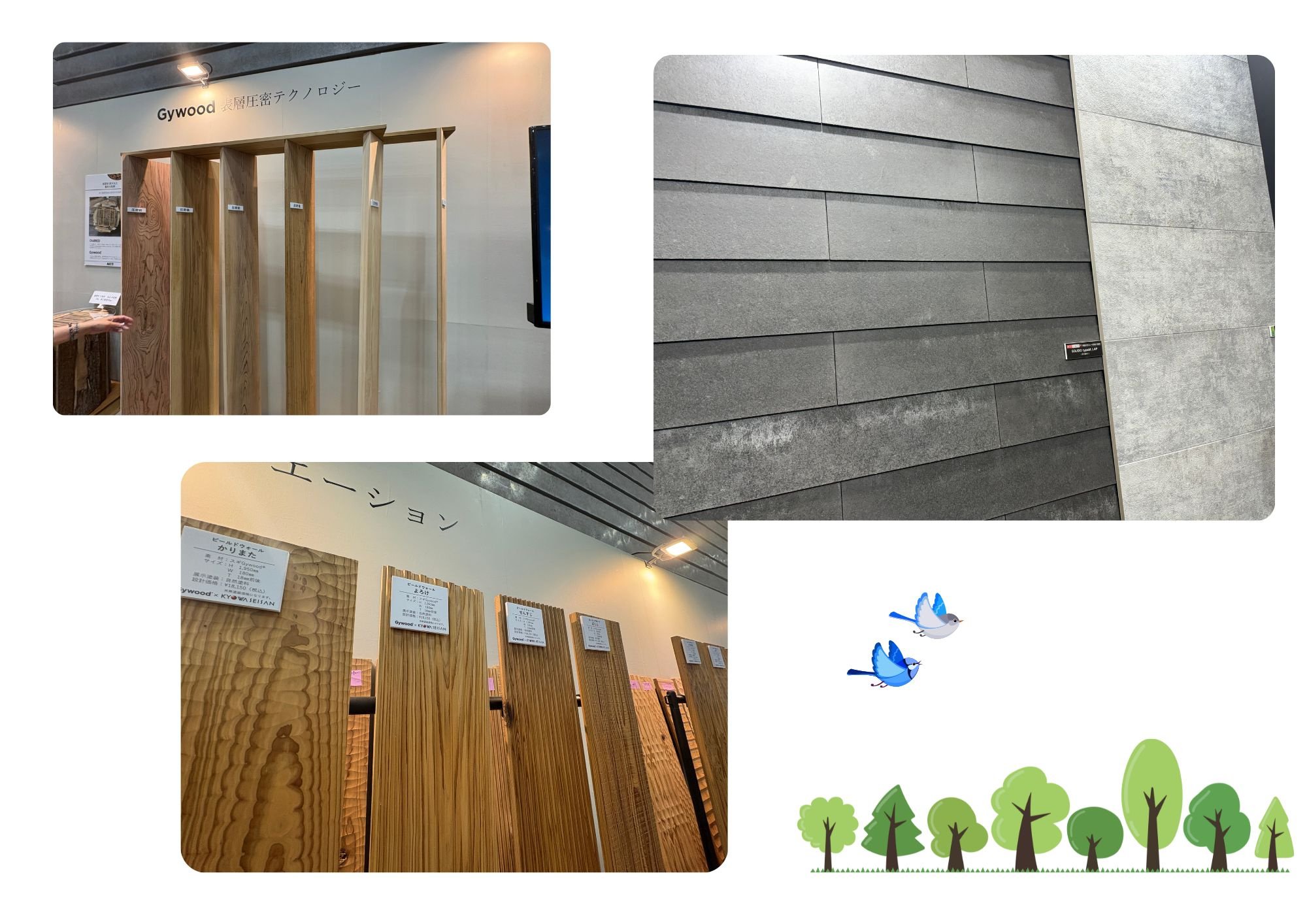 木材の加工見本や、サイディングの見本などが展示されており、