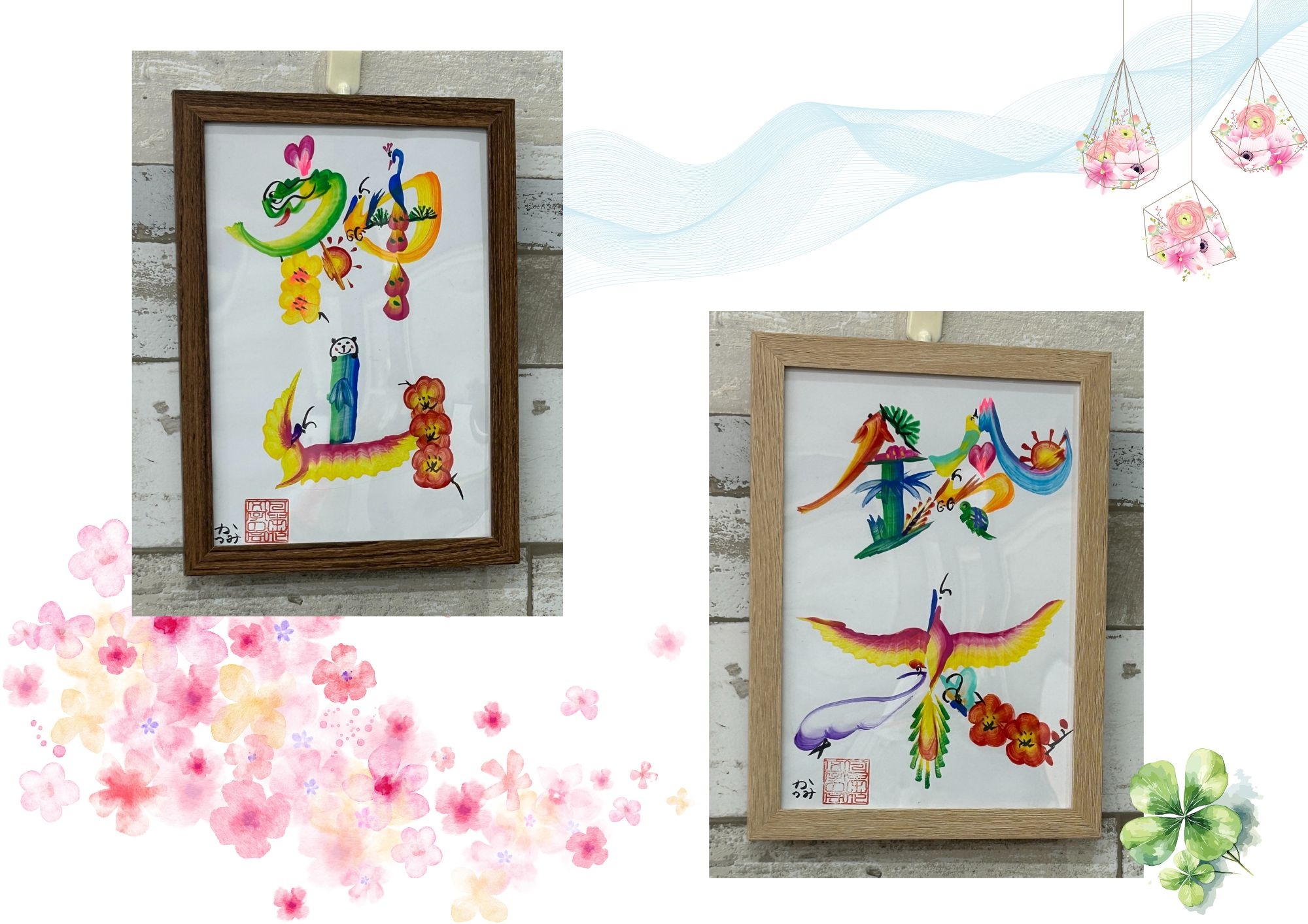 花文字は、縁起の良い動物や植物などを用いて文字を形作り、色鮮やかに描く作品です。
